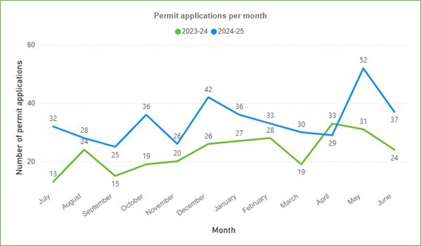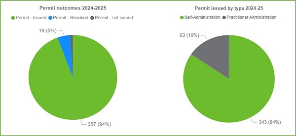 There was an average of 34 permit applications per month in 2024-25, an increase from an average of 23 applications per month in 2023-24. A higher proportion of practitioner administration permits were issued in 2024-25 compared with 2023-24.
