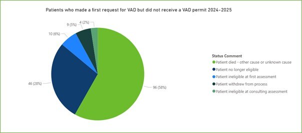 In 2024-2025 there were 462 consulting assessments and 459 people were assessed as eligible for voluntary assisted dying at the consulting assessment. Reasons for not progressing from a first assessment to a consulting assessment include: