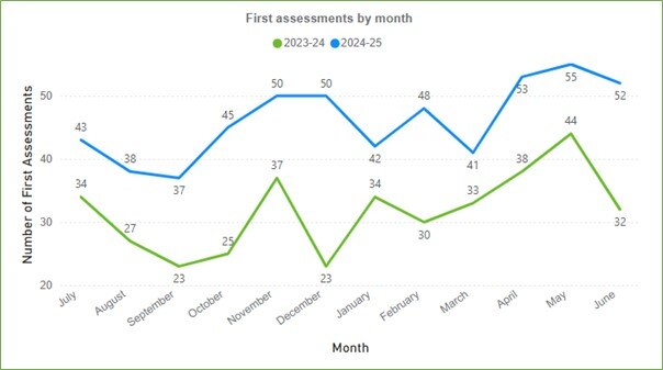 Figure 5 shows an upward trend in first assessments over the past 2 years with an average of 46 per month in 2024-25 up from an average of 32 per month in 2023-24.
